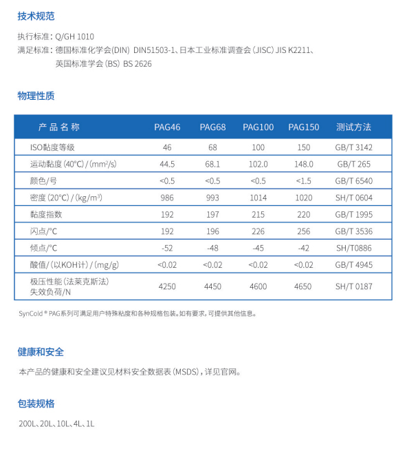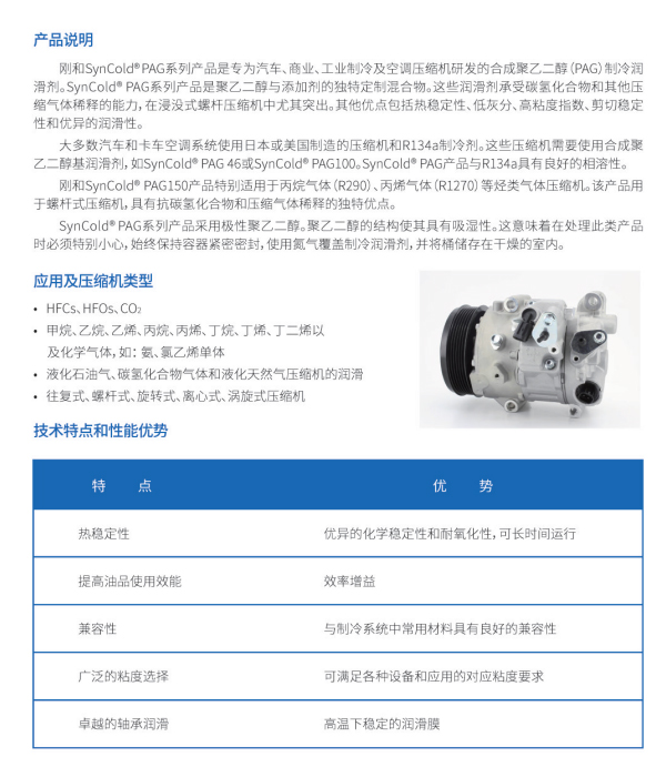 刚和SynCold®PAG系列产品是专为汽车、商业、工业制冷及空调压缩机研发的合成聚乙二醇(PAG)制冷润滑剂。SynCold®PAG系列产品是聚乙二醇与添加剂的独特定制混合物。这些润滑剂承受碳氢化合物和其他压缩气体稀释的能力,在浸没式螺杆压缩机中尤其突出。其他优点包括热稳定性、低灰分、高粘度指数、剪切稳定性和优异的润滑性。